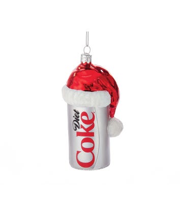 Bring a touch of nostalgic charm to your holiday décor with this Diet Coke can ornament from Kurt Adler. Its glass figural design is modeled after a classic Diet Coke can, topped with a red and white Santa-style hat for an extra festive touch.
